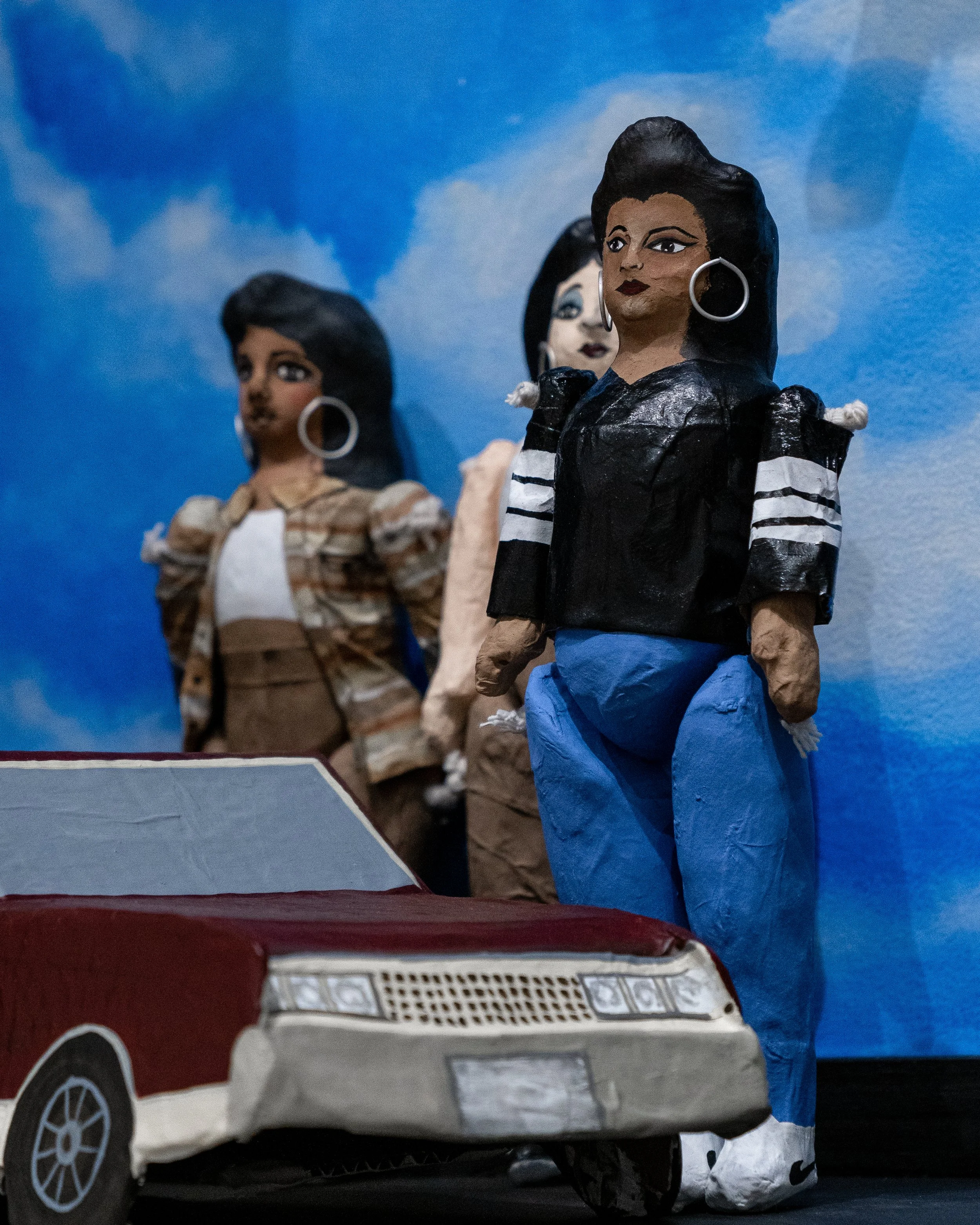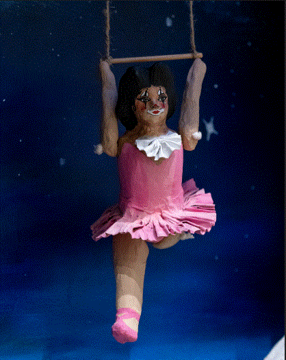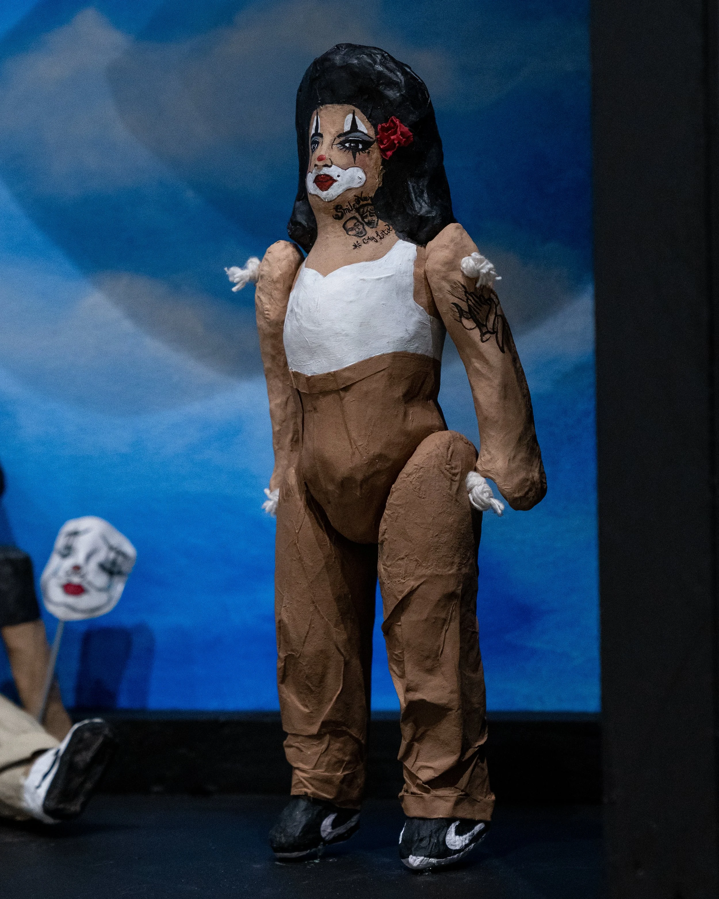 I used this story as inspiration and juxtaposed the trapeze clown dolls with Xicana clown dolls. The archetype of the Xican@ Clown, in particular, has hidden meanings and stories that often represent the complexity of a world where not everything is as it seems. Smile now, cry later. In native spiritualities, the clown is a trickster. One that changes forms and code switches to adapt/survive.